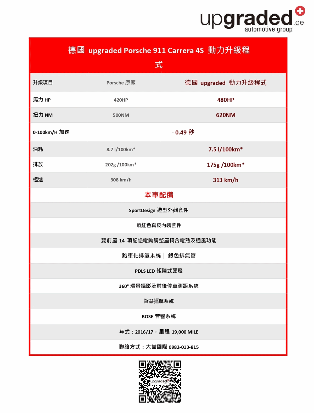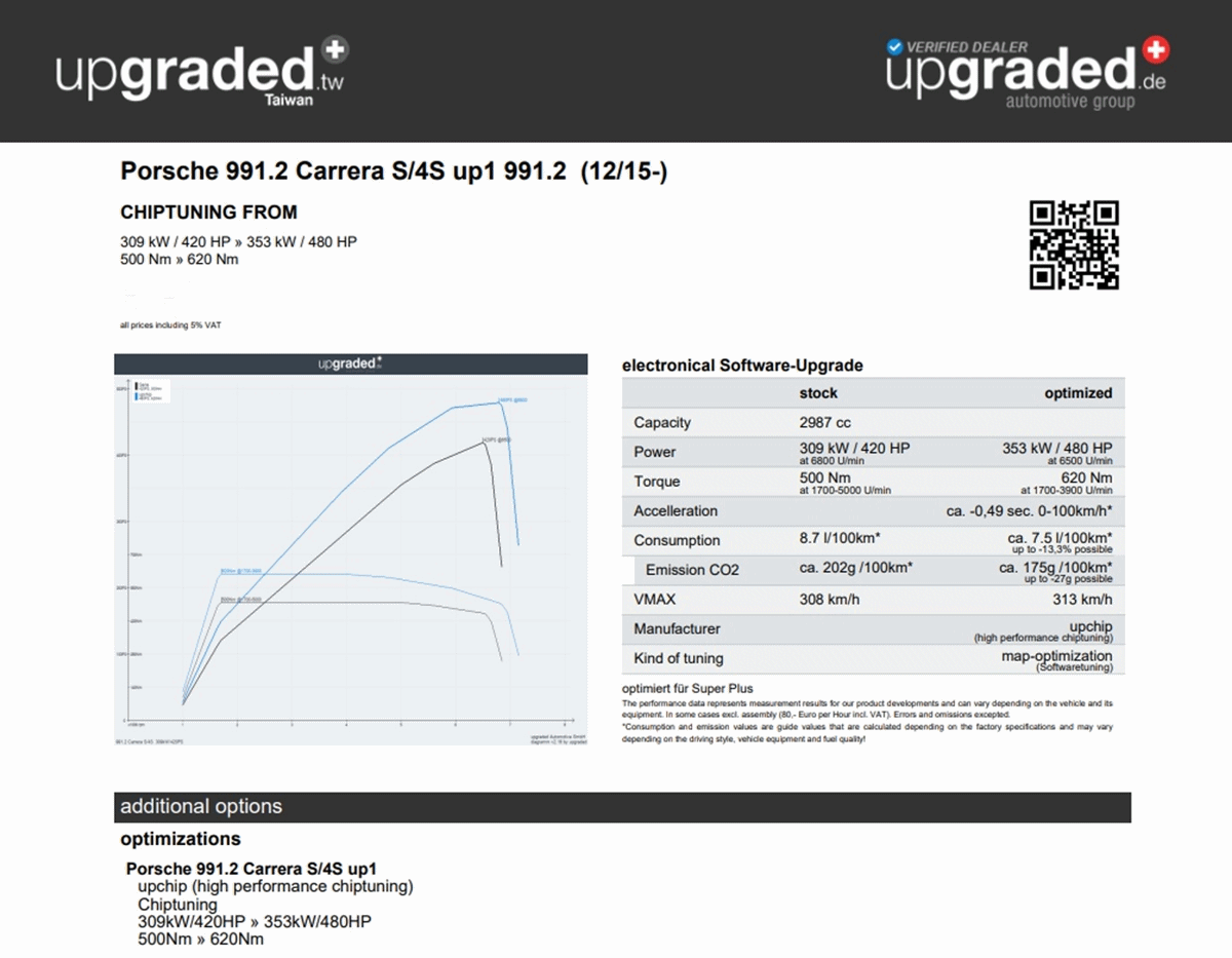 此台保時捷911藉由Upgraded升級一階,馬力從420匹增加至480匹,並優化變速箱程式,更具耐熱保護。